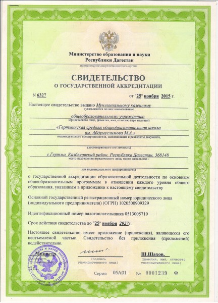 Казбековский район с. Гертма, 368148, улица Сулаймана Шайихмагомедова 4.